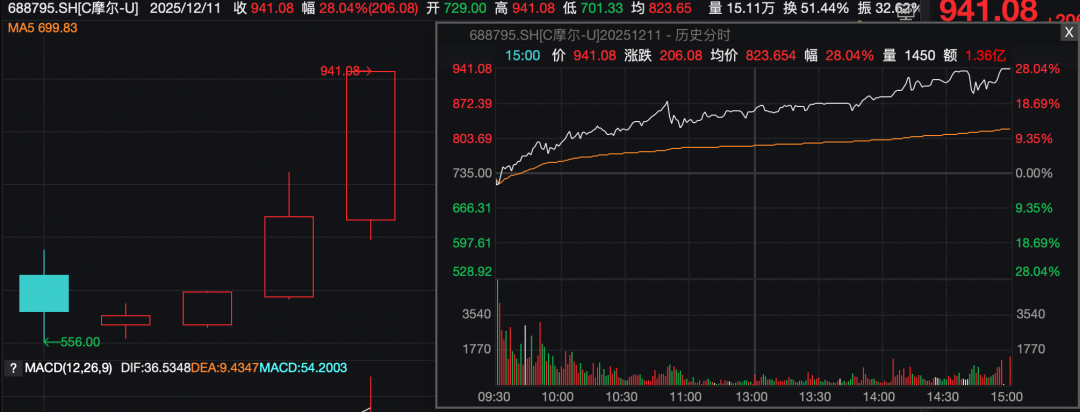 今日(12月11日)午后,摩尔线程股价进一步走高,盘中股价突破900元。截至收盘,摩尔线程股价报941.08元/股,涨幅为28.04%,再度刷新历史高点。如果投资者中签摩尔线程新股且能持有至今,按收盘价计算,单签浮盈将超过40万元。不过,数据显示,由于摩尔线程上市后换手率一直较高,中签后能一直持有至今的投资者或极少。